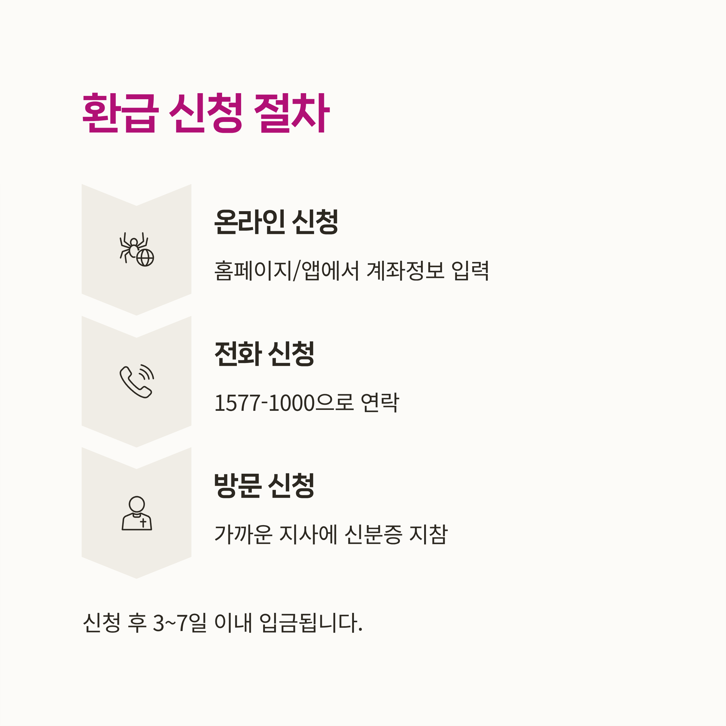 상담원과 통화하여 본인 확인 절차를 거친 후 환급 신청을 할 수 있어요. 통화량이 많을 때는 대기 시간이 길 수 있으니 참고하세요.