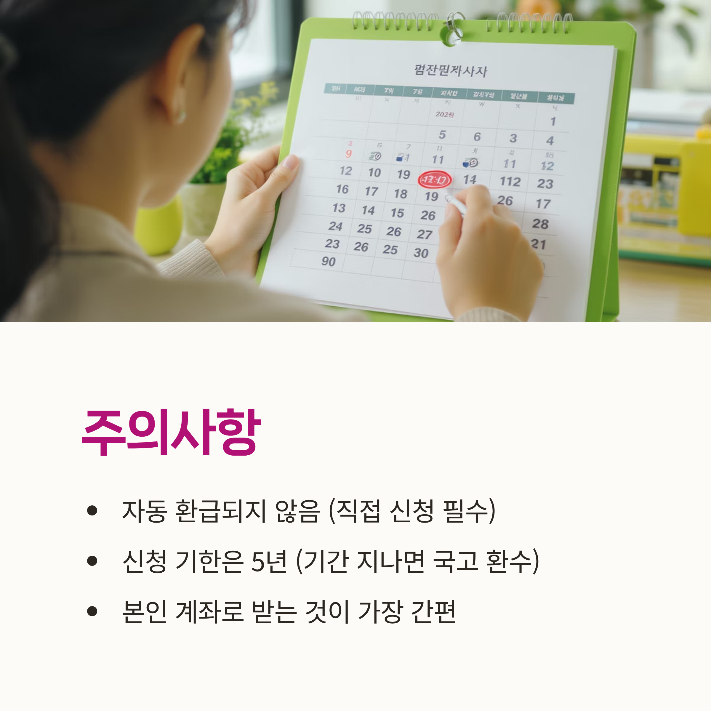 환급금 신청 기한은 5년입니다. 이 기간이 지나면 자동으로 국고로 돌아가니 빨리 확인하고 신청하세요.