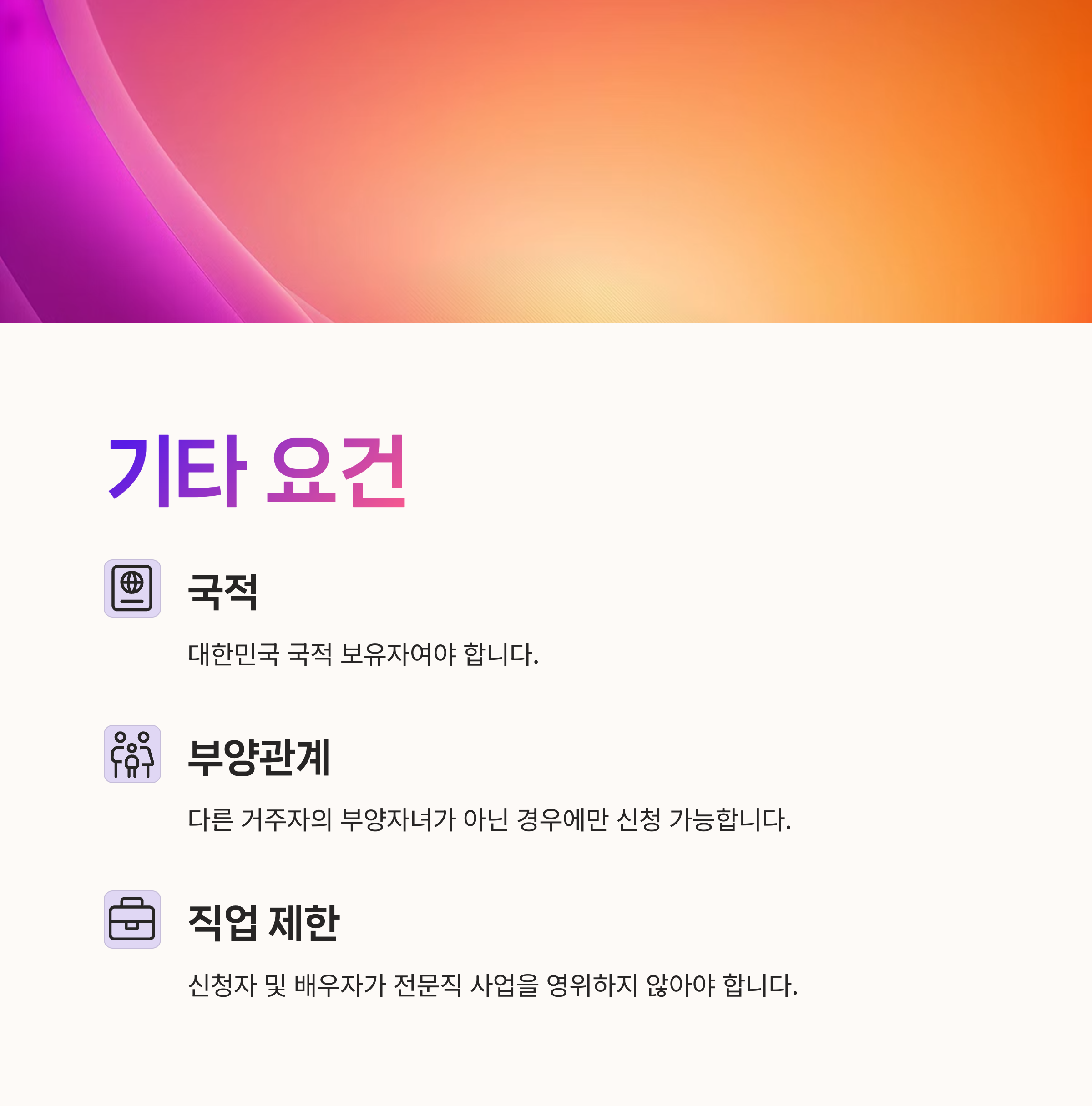 - 신청자 및 배우자가 전문직 사업을 영위하지 않아야 합니다.