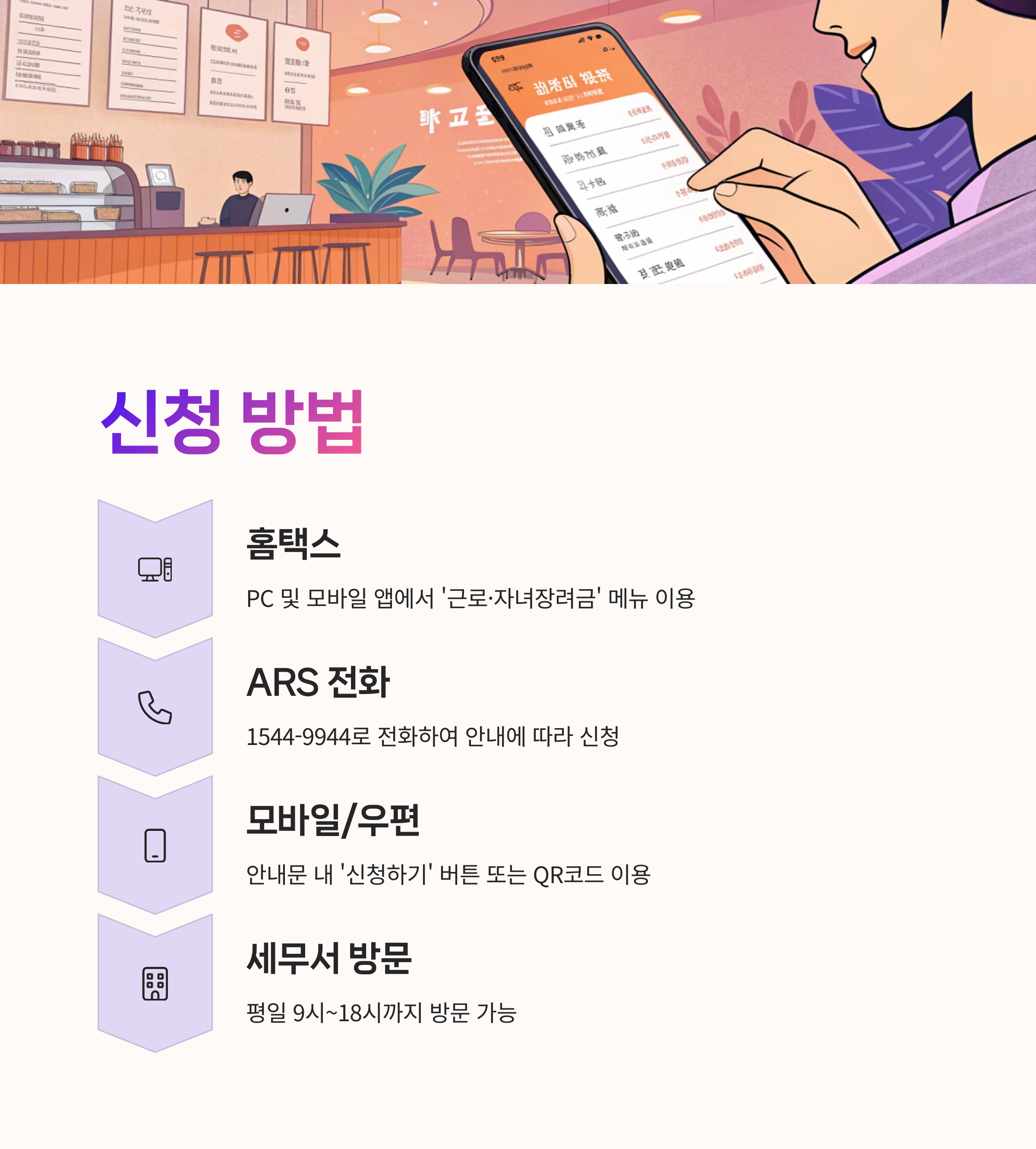 - 홈택스에 로그인한 후, ‘근로·자녀장려금’ 메뉴에서 신청할 수 있습니다.