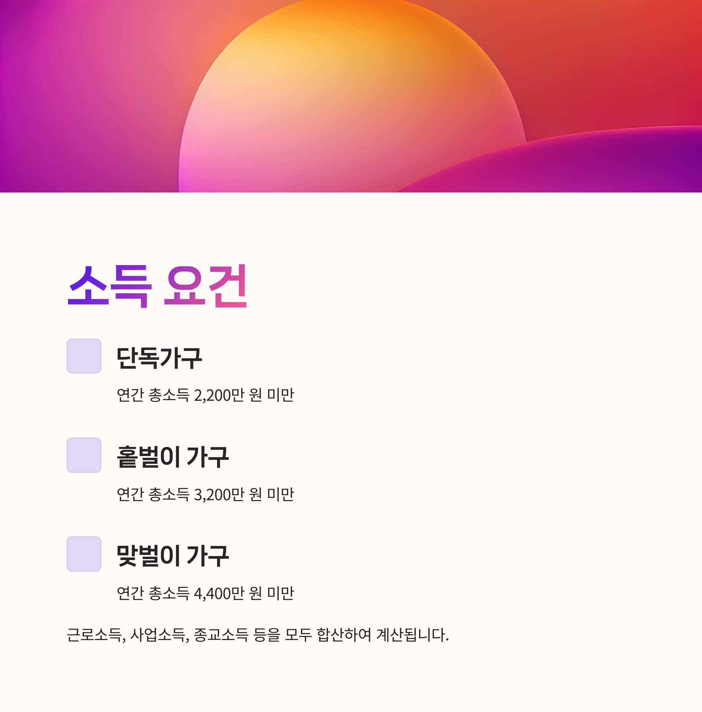 - 맞벌이 가구: 연간 총소득이 4,400만 원 미만이어야 합니다.
