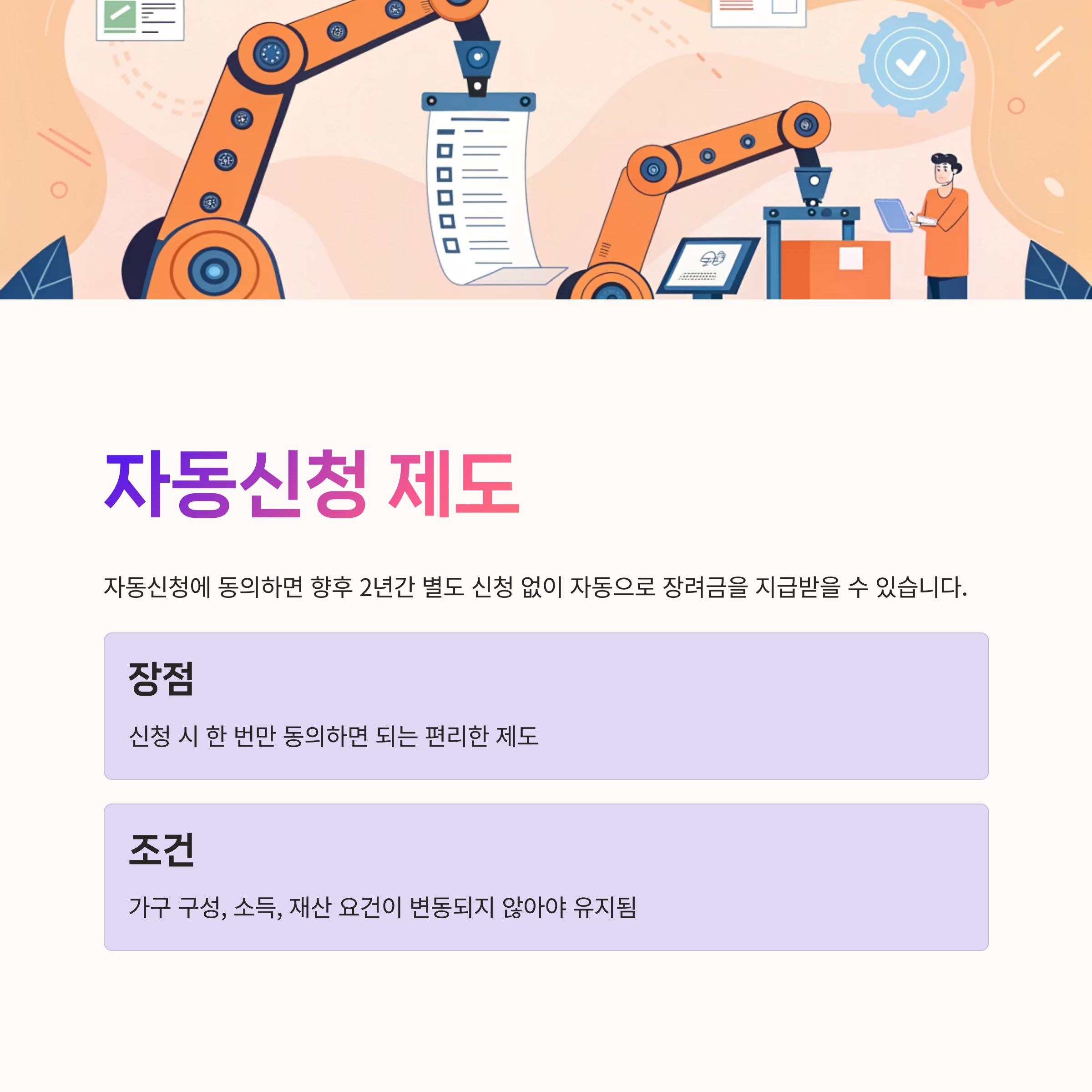 자동신청 제도는 신청 시 한 번만 동의하면 되는 편리한 제도이므로, 장려금 수급을 놓치지 않기 위해 적극 활용하는 것이 좋습니다.
