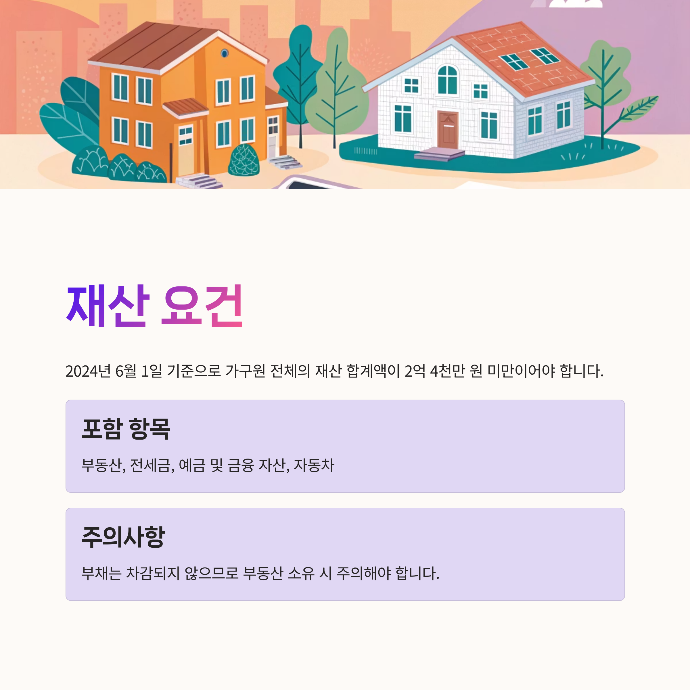 재산 요건은 2024년 6월 1일 기준으로 가구원 전체의 재산 합계액이 2억 4천만 원 미만이어야 합니다.