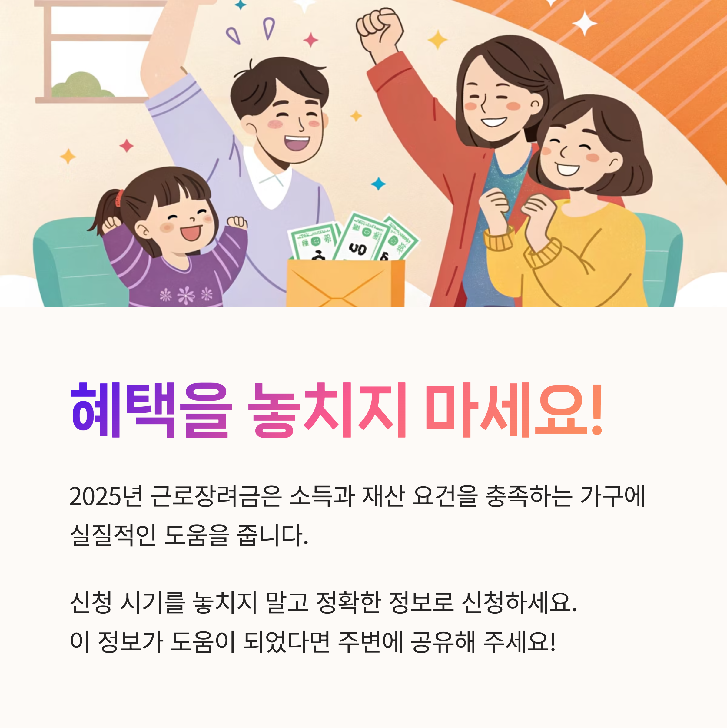 2025년 근로장려금은 소득과 재산 요건을 모두 충족하는 가구를 대상으로 지급됩니다.