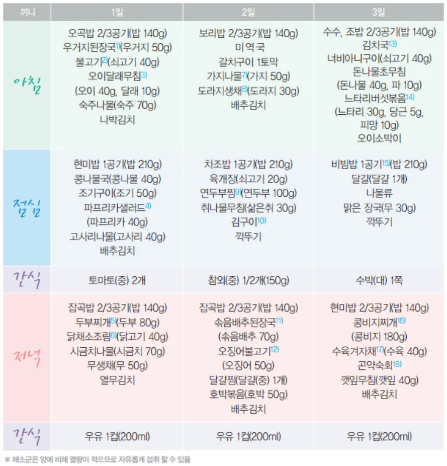 식단표를 참고하셔서 개인에 맞게 적용하세요.