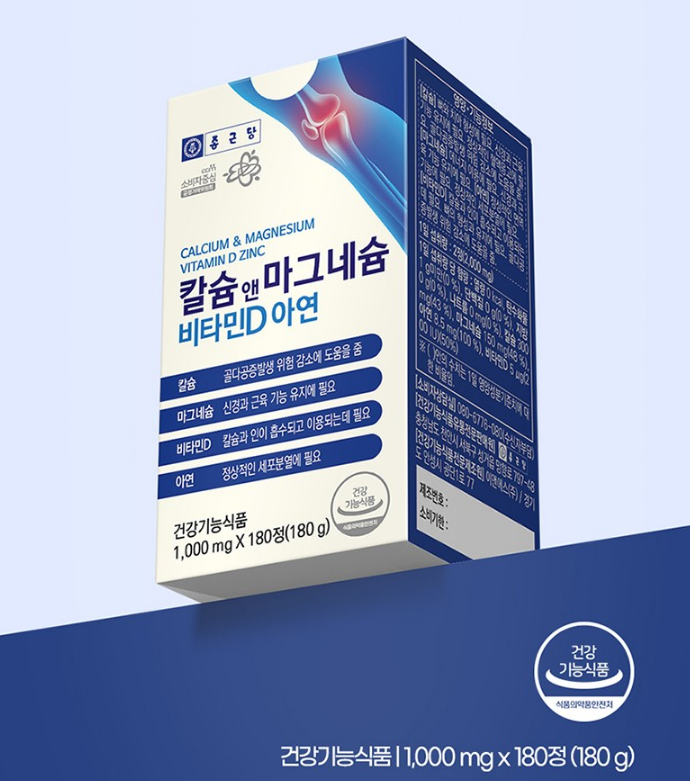 그렇게 찾아보다가 알게 된 제품이 바로 종근당 칼슘 앤 마그네슘 비타민D 아연이에요. 이름부터 딱! 필요한 성분이 다 들어있죠. 180정짜리 대용량이라 하루 두 알씩 넉넉하게 3개월 먹을 수 있는 점도 마음에 들었고, 무엇보다 종근당이라는 제약회사 브랜드라서 믿음이 갔어요.