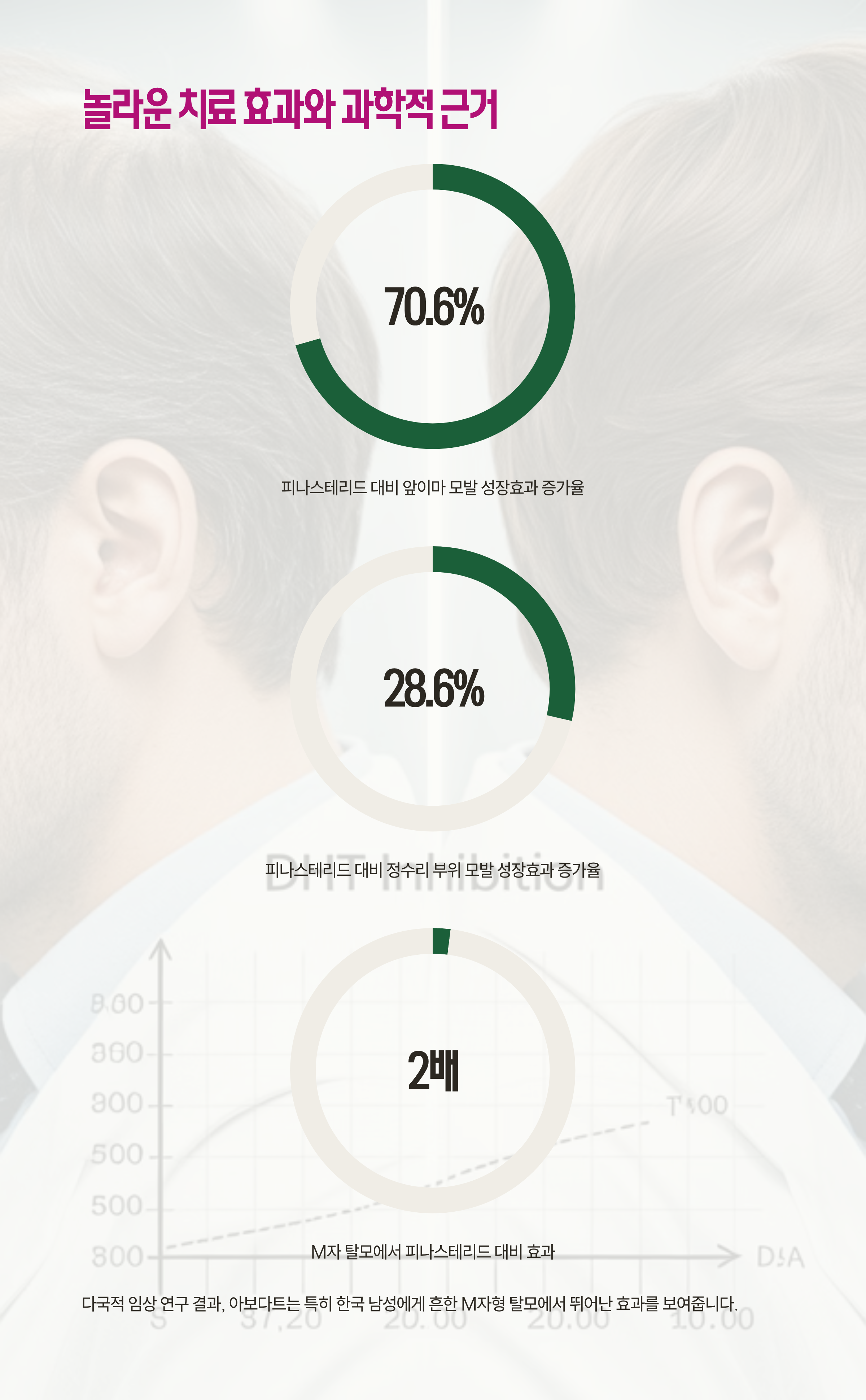 임상 데이터를 살펴보면 더욱 놀라운 결과를 확인할 수 있습니다. 아보다트 0.5mg 복용군은 피나스테리드 1mg 복용군보다 앞이마 모발 성장효과가 70.6% 높았으며, 정수리 부위 역시 28.6% 더 높은 모발 성장효과를 보였습니다.