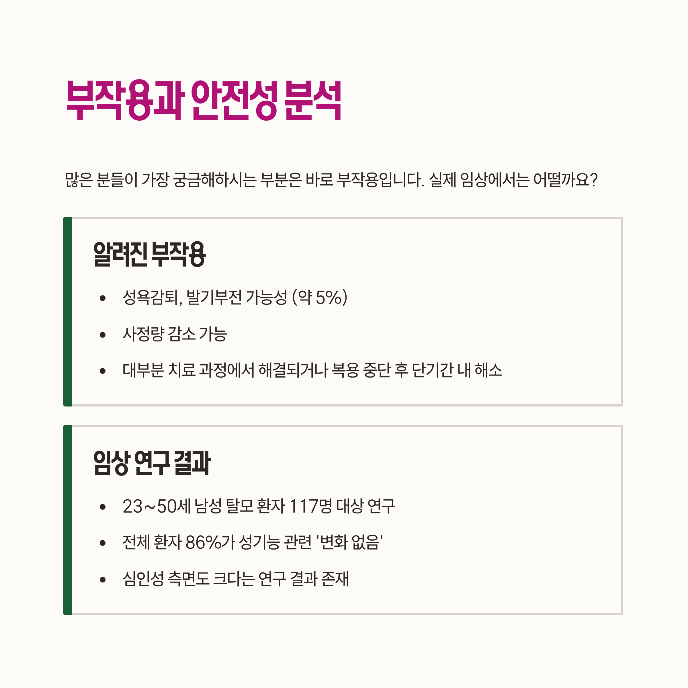 많은 분들이 가장 궁금해하시는 부분이 바로 부작용입니다. 남성형 탈모약의 주된 성분인 피나스테리드, 두타스테리드 계열의 약은 드물지만 부작용이 있을 수 있습니다. 성욕감퇴, 발기부전이 발생할 수 있고, 사정량이 감소할 수 있지만 성 기능을 방해하지는 않습니다.