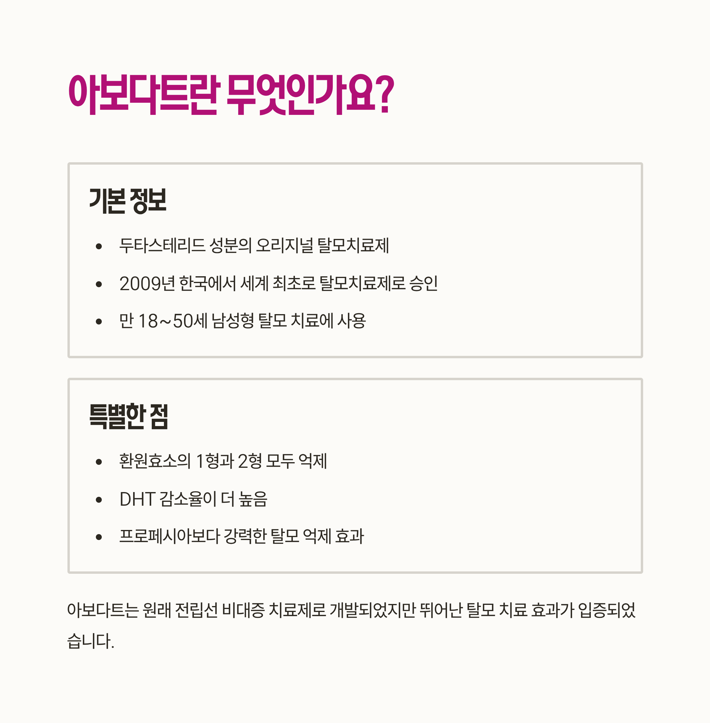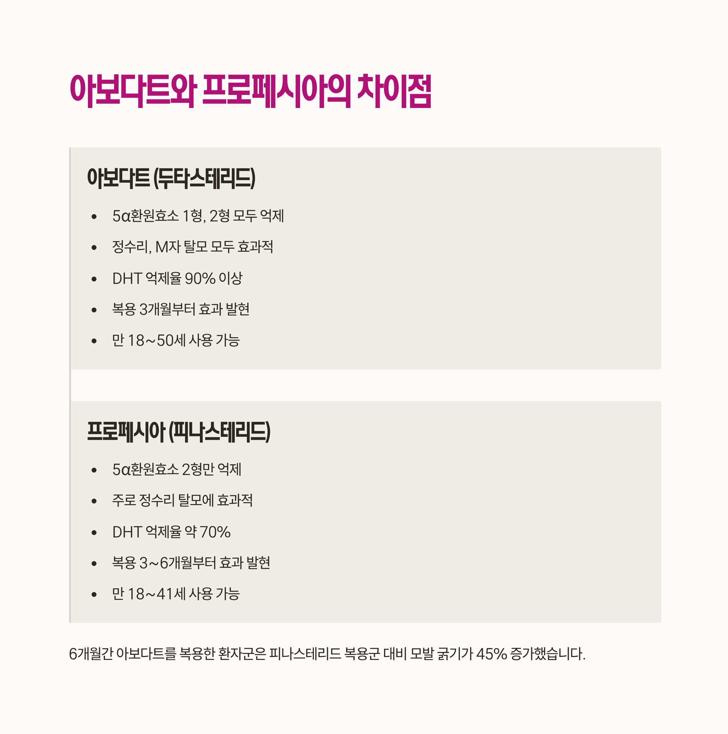 | 구분 | 아보다트 (두타스테리드) | 프로페시아 (피나스테리드) |