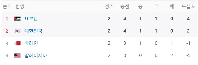 한국 대표팀은 요르단과의 경기에서 승리하기 못하고 무승부로 조 2위를 차지했습니다. 한국은 말레이시아와의 경기에서 반드시 이겨야 합니다. 말레이시아는 김판곤 감독의 지휘아래 42년만에 자력 진출의 꿈을 이루기는 했지만, 현실은 중동축구의 실력에 밀려 성적이 부진했습니다.