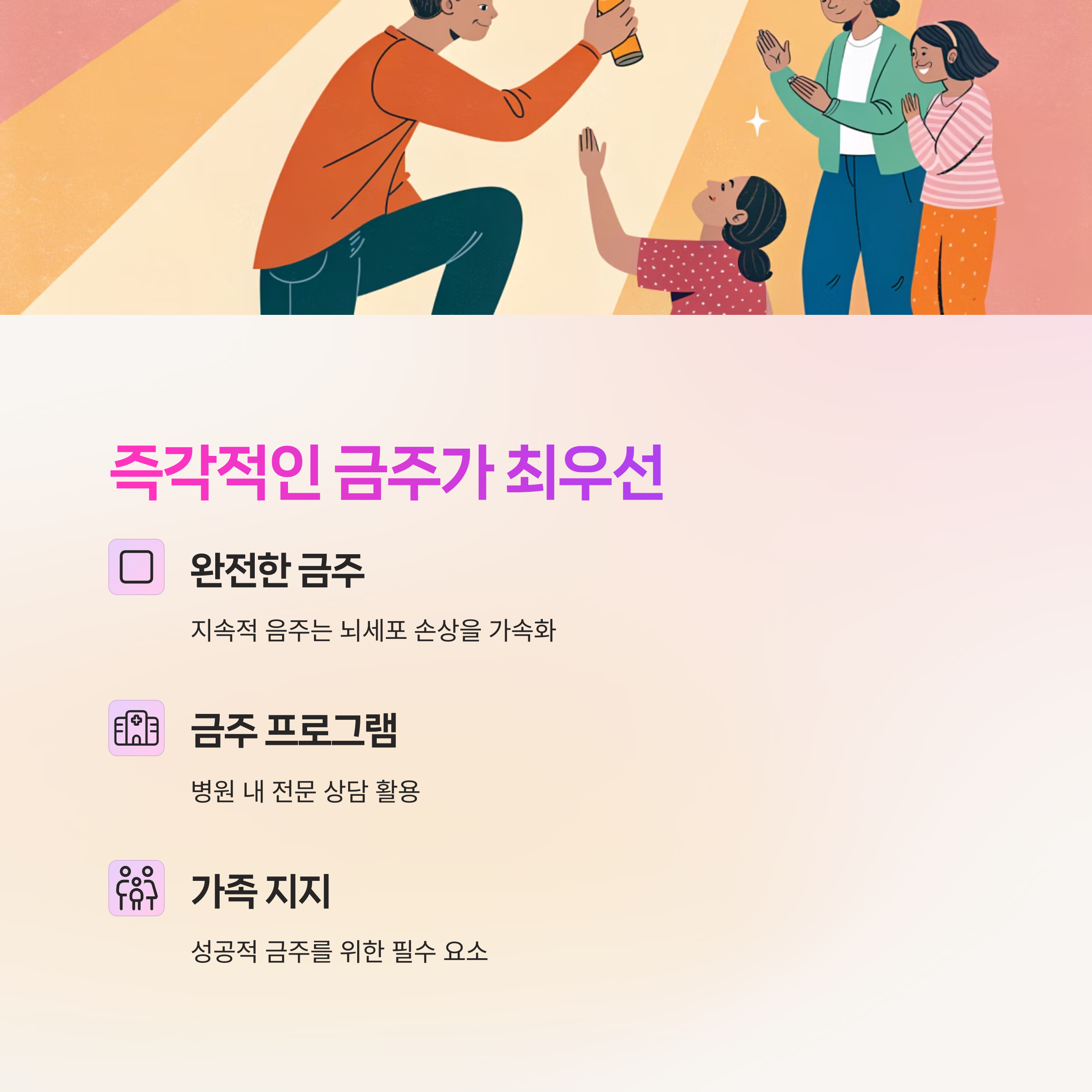 지속적인 음주는 뇌세포를 더욱 손상시키고 인지기능 저하를 가속화시키므로, 즉각적인 금주는 필수적입니다.
