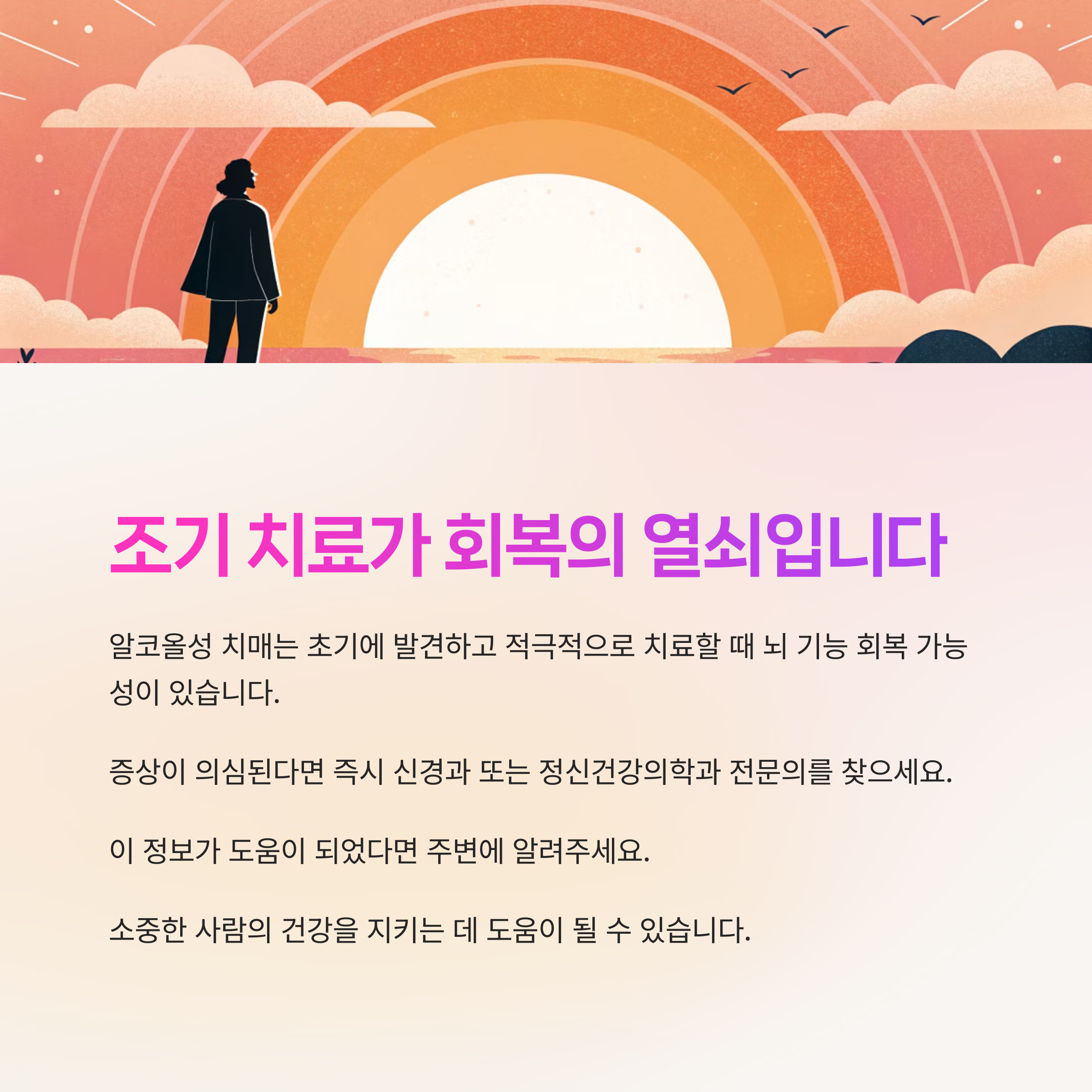 꾸준한 금주와 치료 의지, 주변의 지지가 치매 극복에 중요한 요소로 작용합니다.