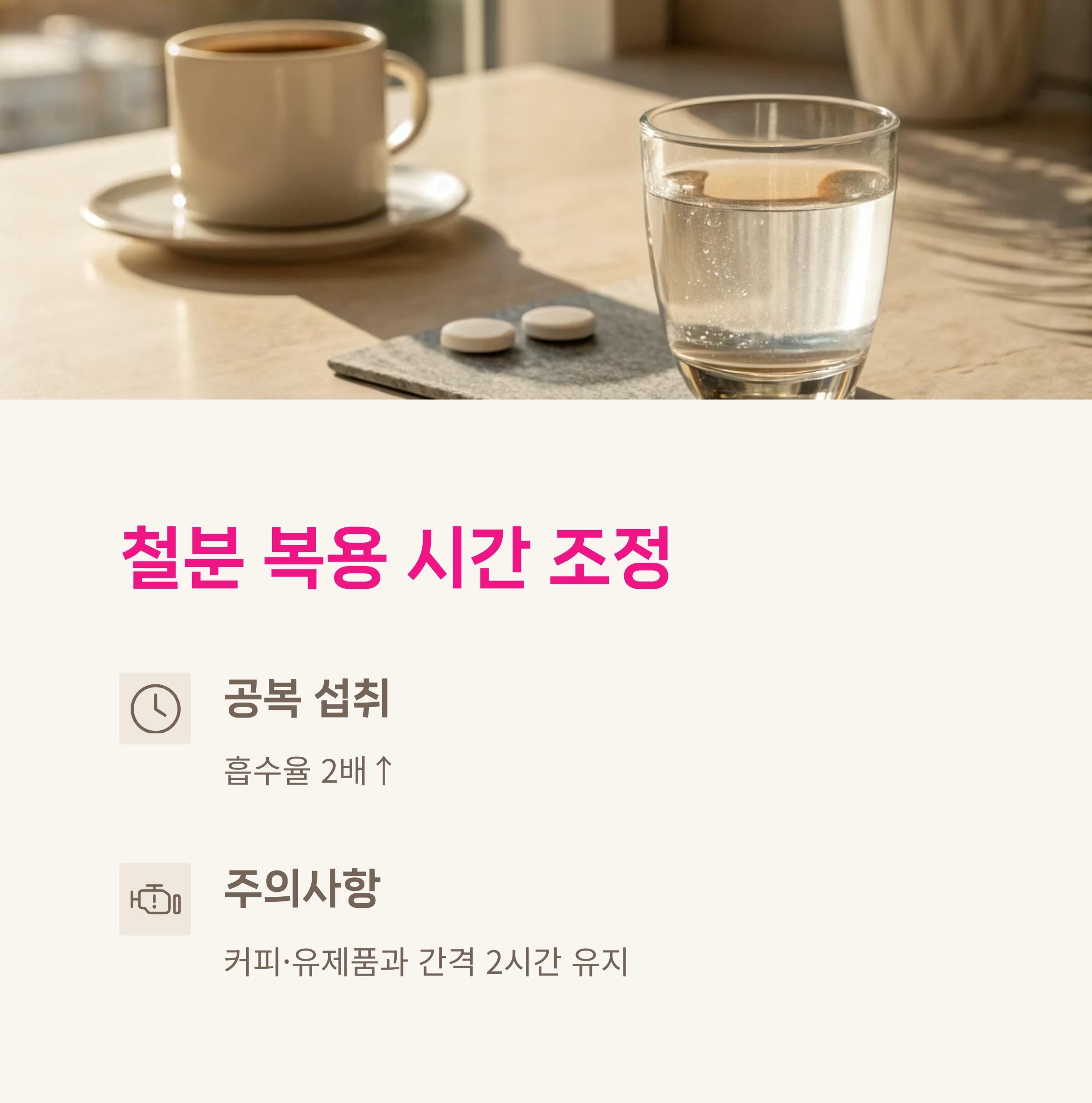 철분 복용 후 1~2시간 내에는 커피나 차를 마시지 않는 것이 흡수율을 높이는 비결입니다.