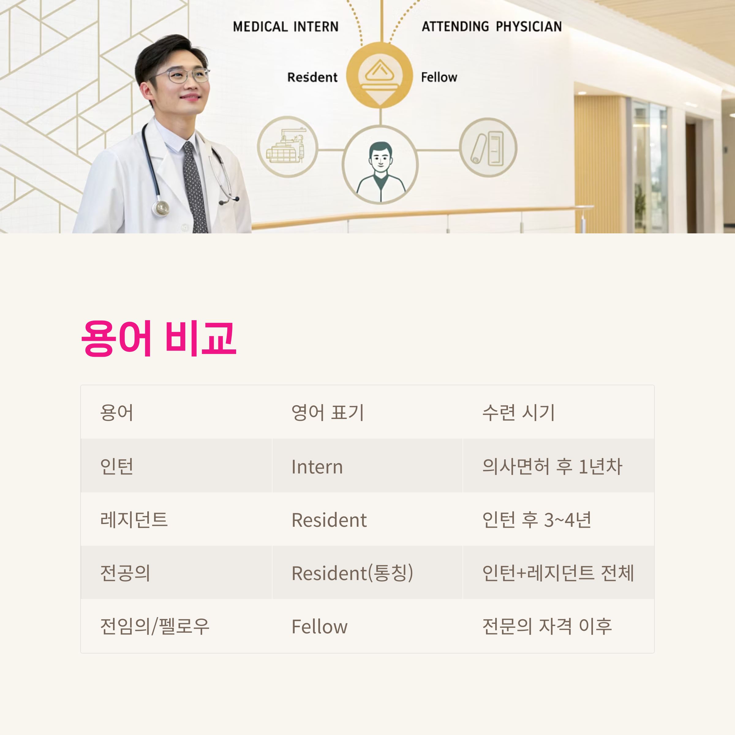 | 전공의 | Resident(통칭) | 인턴+레지던트 전체 기간 | 전문의 전 수련 전체를 아우르는 개념 |