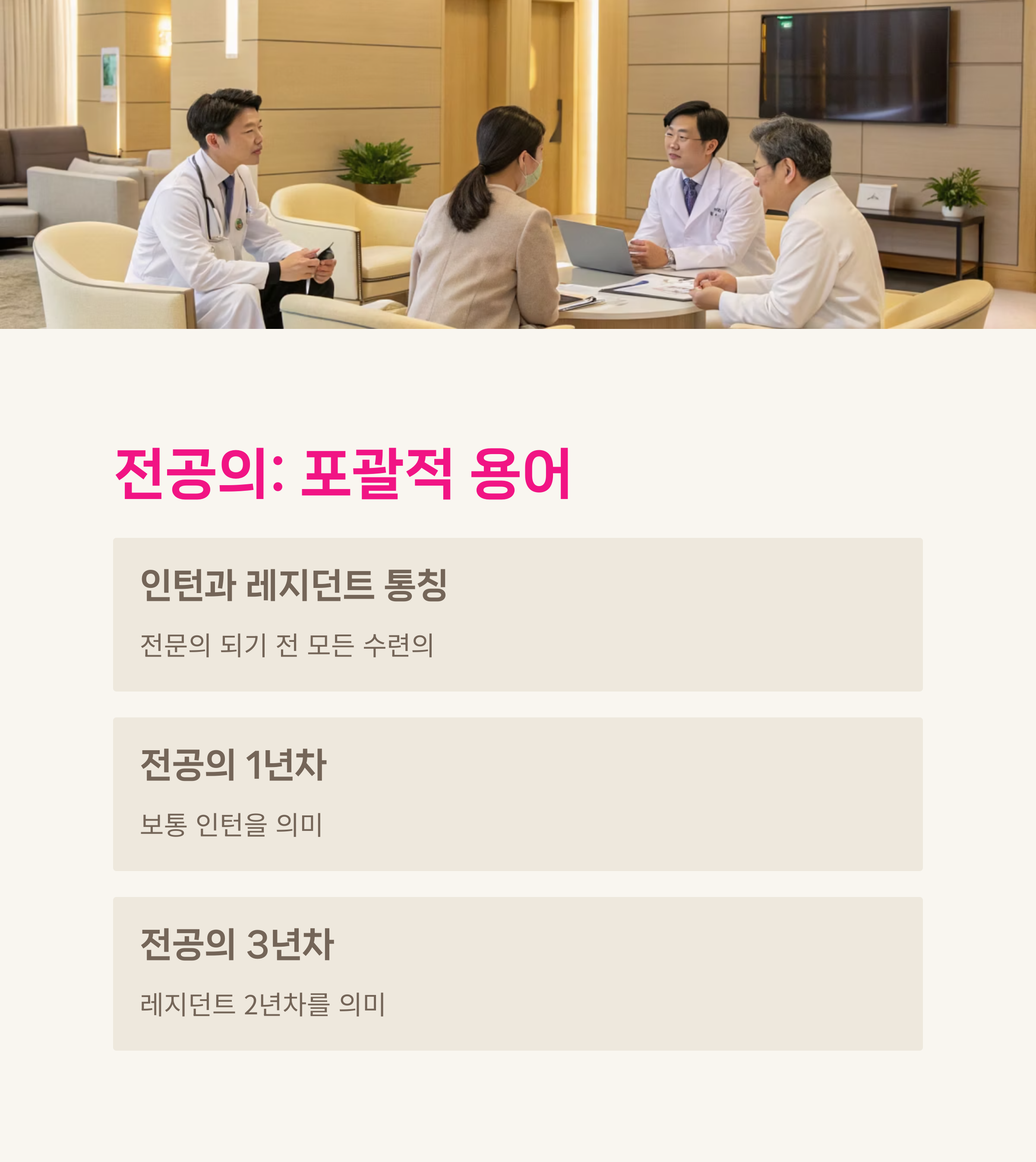 전공의는 인턴과 레지던트를 통틀어 지칭하는 표현으로, 전문의가 되기 전 모든 수련의를 의미합니다. 이 용어는 수련 단계 전반을 총칭하는 범용어로 이해하면 됩니다.