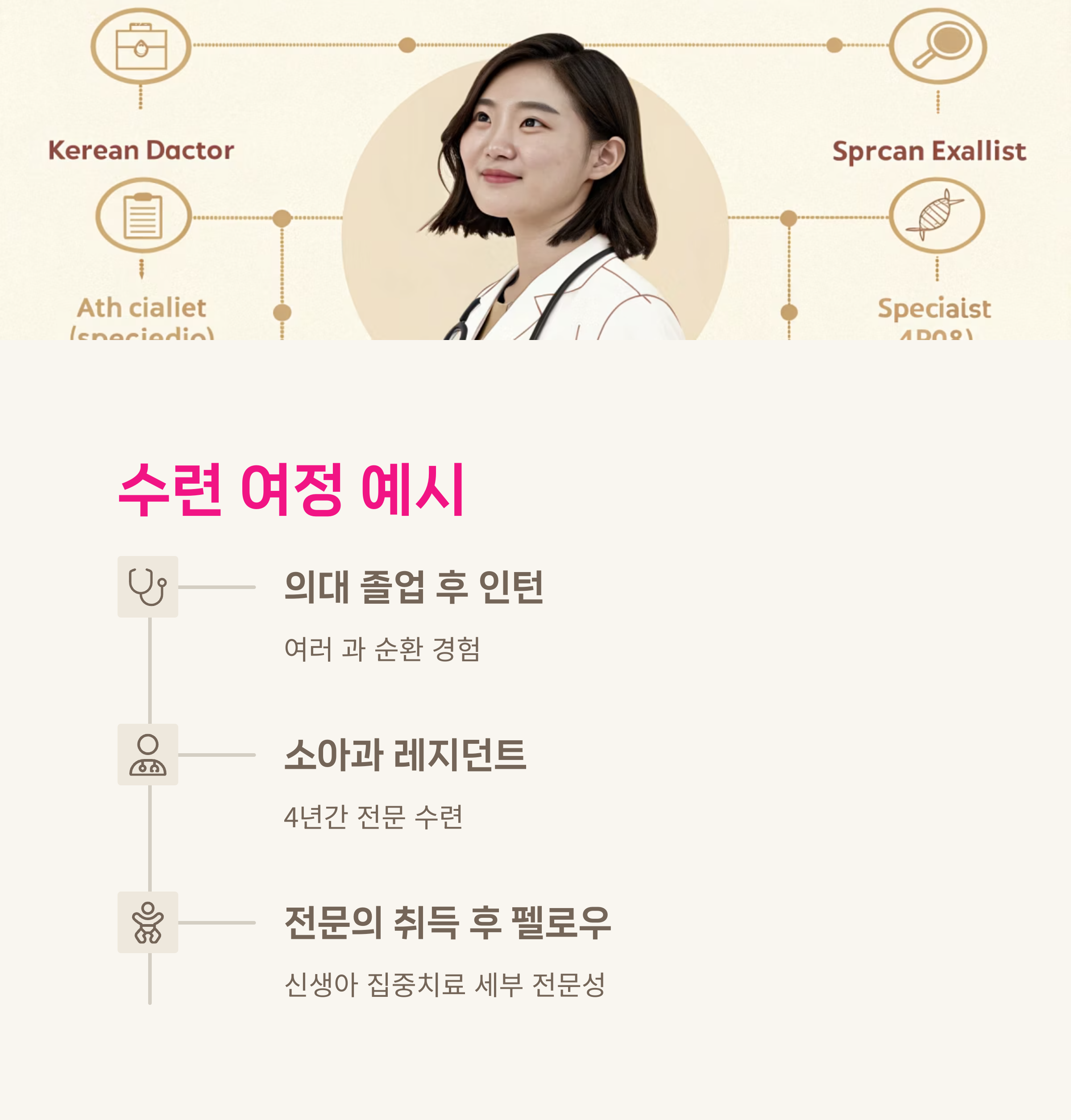 "의대 졸업 후 국가시험에 합격한 민수는 인턴으로 병원에 들어가 여러 과를 돌았다. 그 후 그는 소아과를 선택해 레지던트 수련을 받았고, 4년 뒤 전문의가 되었다. 전문의 자격을 얻은 민수는 더 전문적인 신생아 집중치료를 공부하기 위해 전임의(펠로우) 과정에 들어가 세부 전문성을 키우게 되었다."