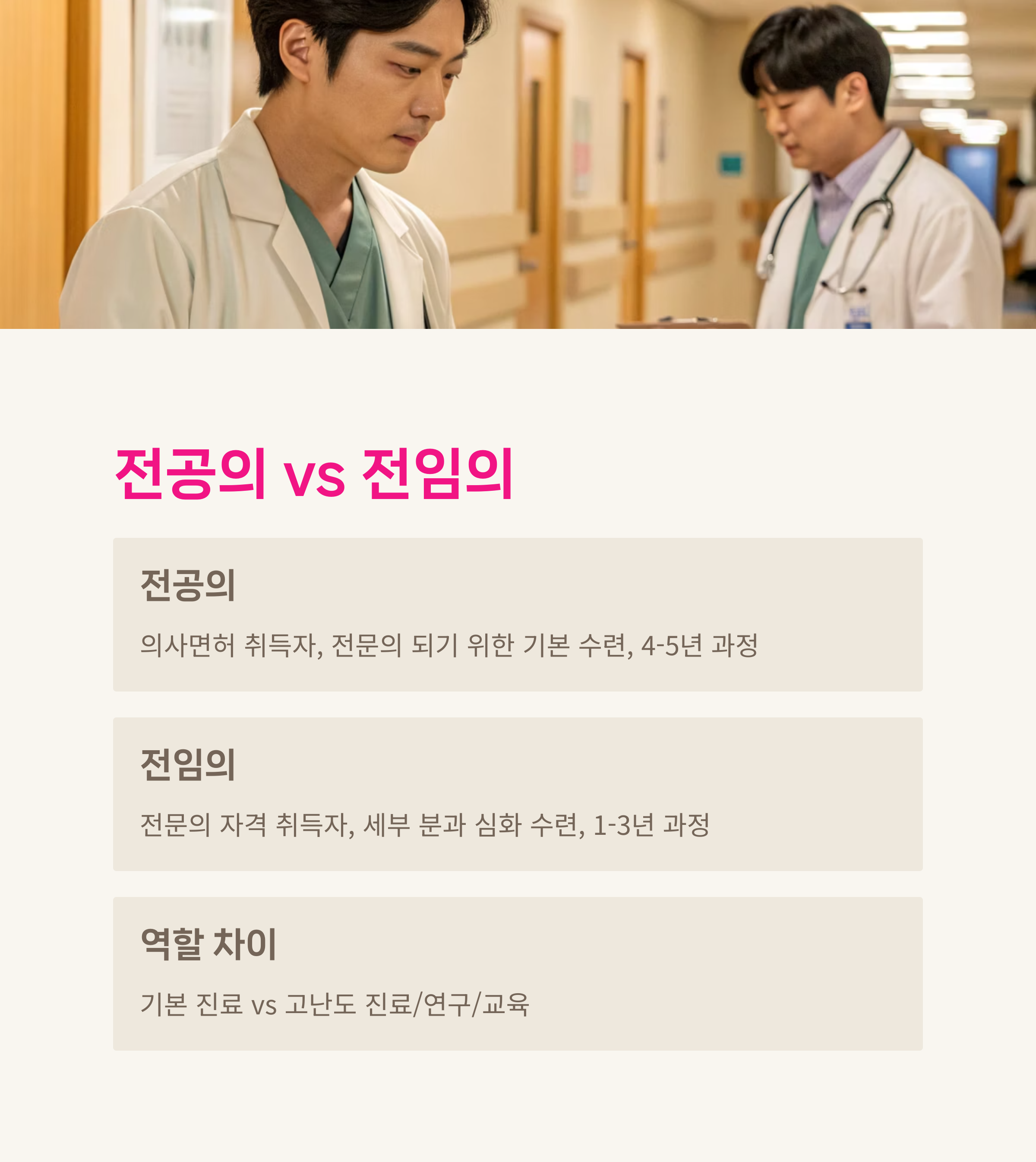 | 역할 | 환자 진료, 병동 관리, 수술 보조 등 | 고난도 진료, 연구, 교육 참여 |