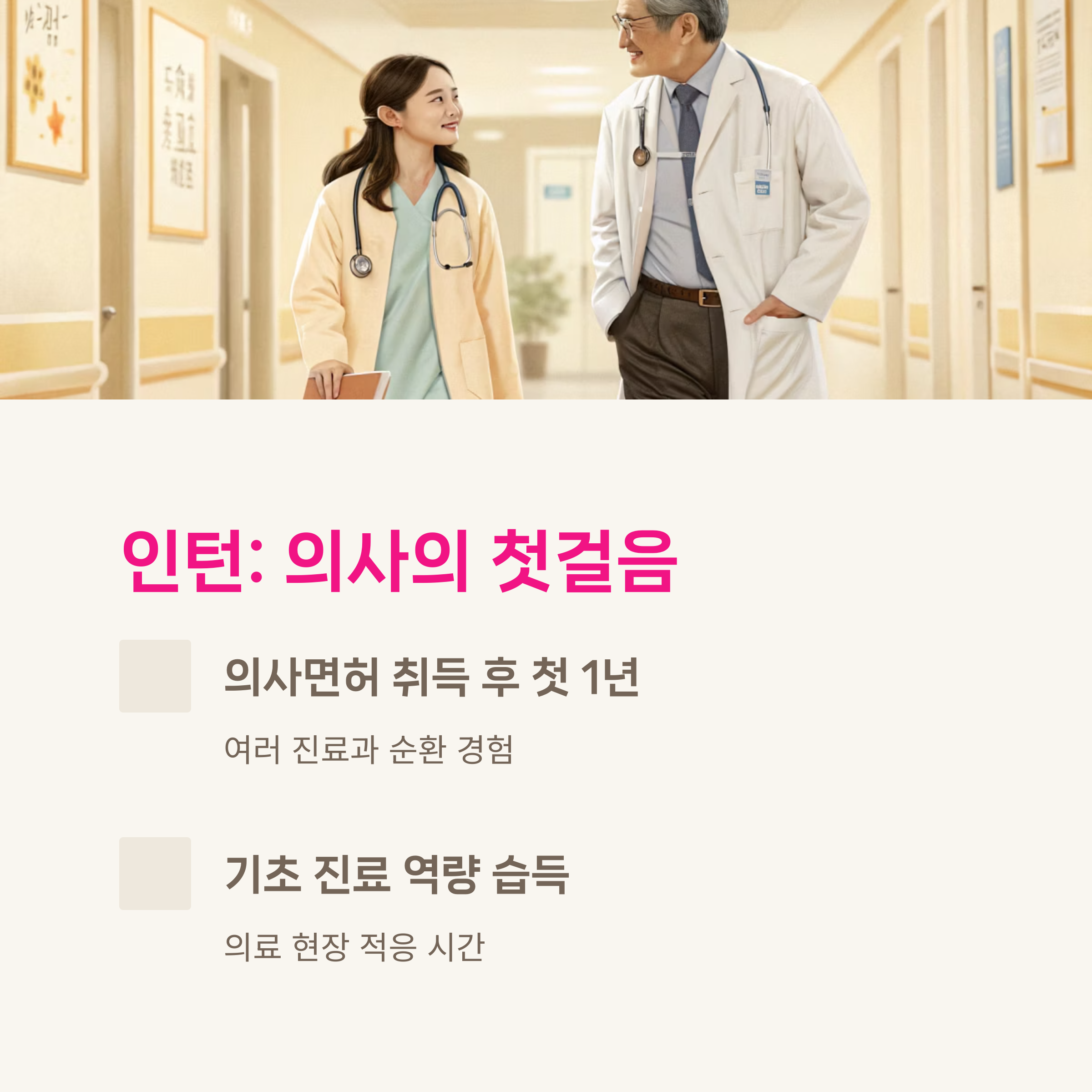 인턴은 의사면허를 취득한 후 처음 1년간의 수련 기간입니다. 이 시기에는 특정 진료과를 정하지 않고 여러 과를 순환하며 경험을 쌓습니다. 기초 진료, 환자 관리, 잡무, 병동 업무 등을 수행하며 의료 현장에 적응하는 시간입니다.