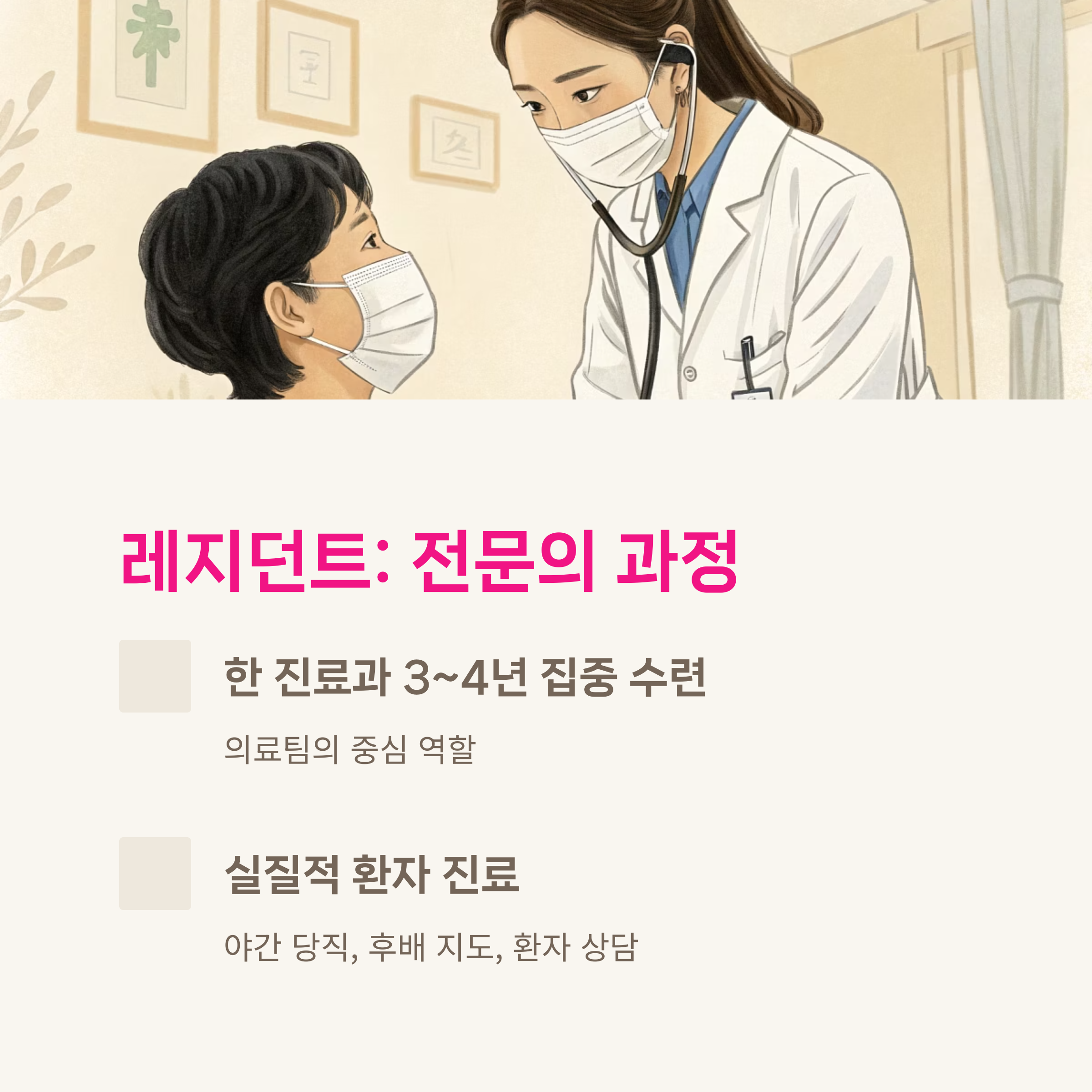 | 레지던트 | Resident | 인턴 후 3~4년 수련 | 특정 과 전공, 임상 실무의 중심 역할 수행 |