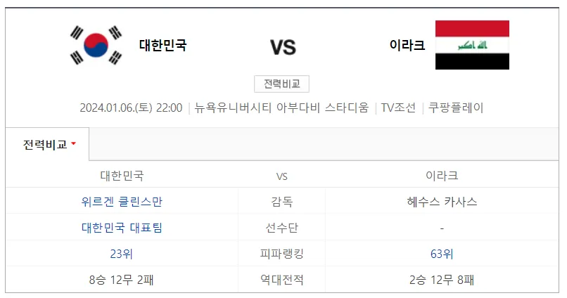 한국은 이라크와의 대결에서 8승, 12 무, 2패입니다. FIFA 랭킹은 한국(23위), 이라크(63위)입니다.