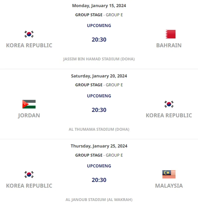 한국 대표팀은 이라크와의 평가전을 하고 난후, 아시안컵에서 금메달을 향해 카타르로 이동합니다. 그리고 바레인, 요르단, 말레이시아와의 경기가 이어집니다. 1월 15일 월용일 오후 8시 30분 바레인과 첫경기가 있습니다.