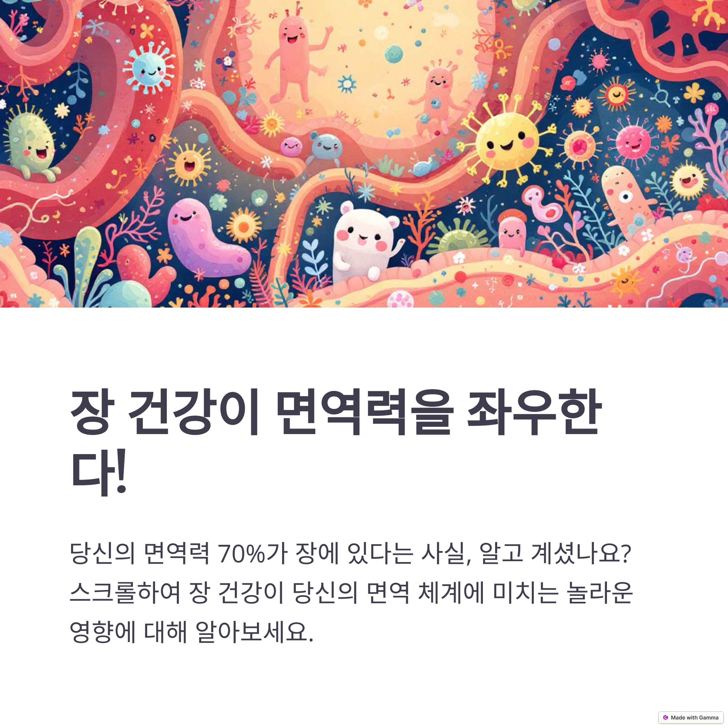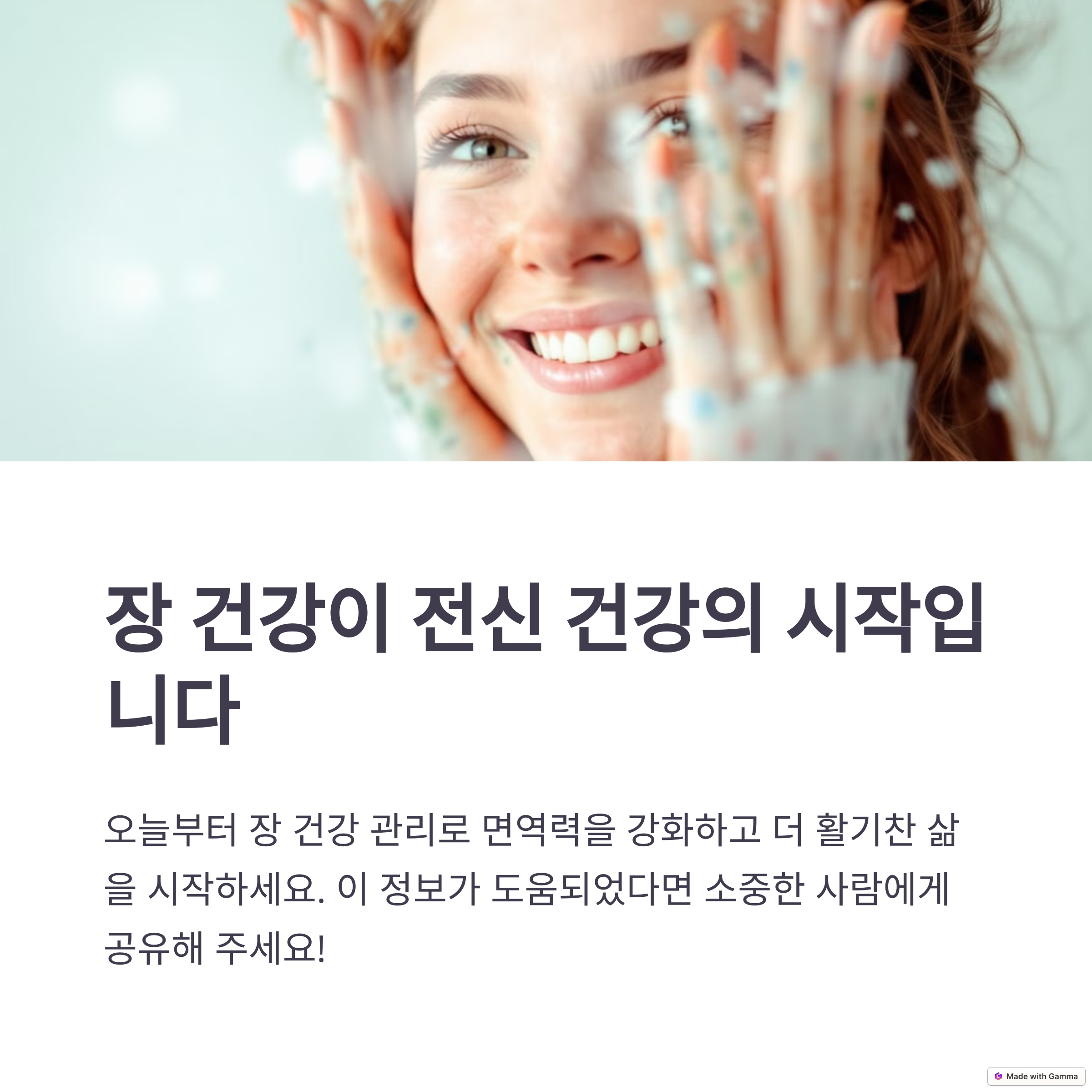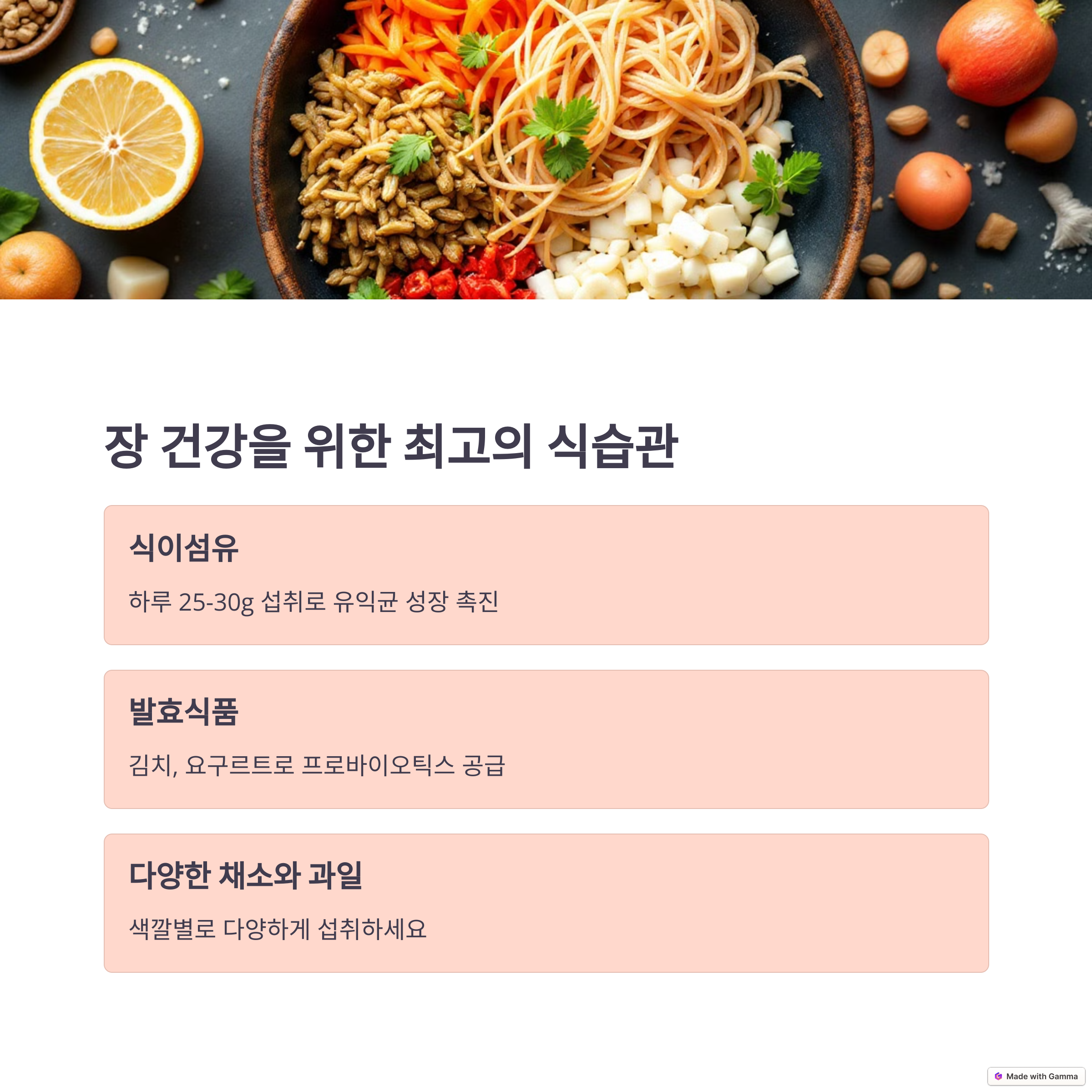 | 면역력 강화 | 장 건강이 면역 체계에 미치는 영향은 매우 큽니다. |