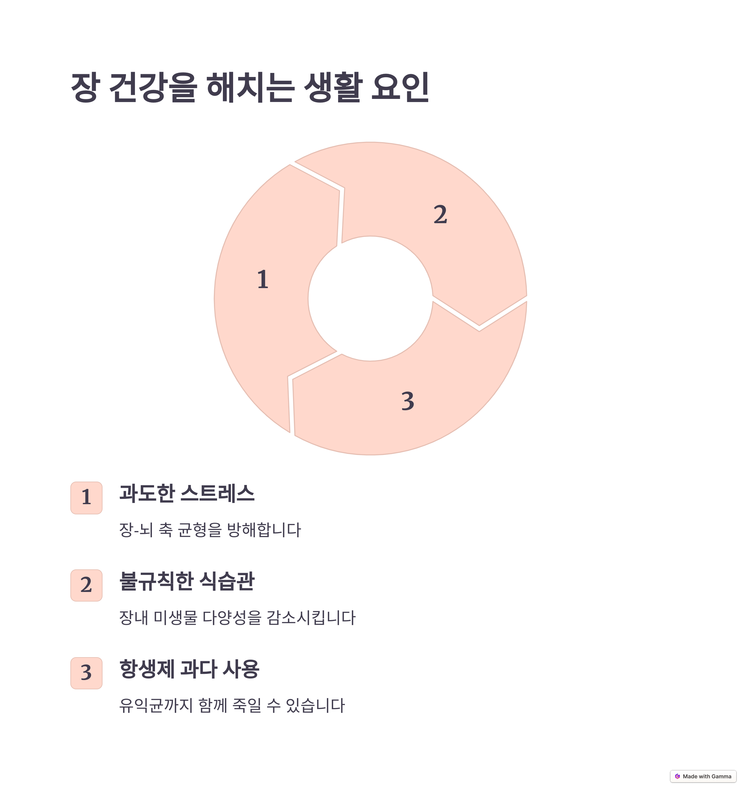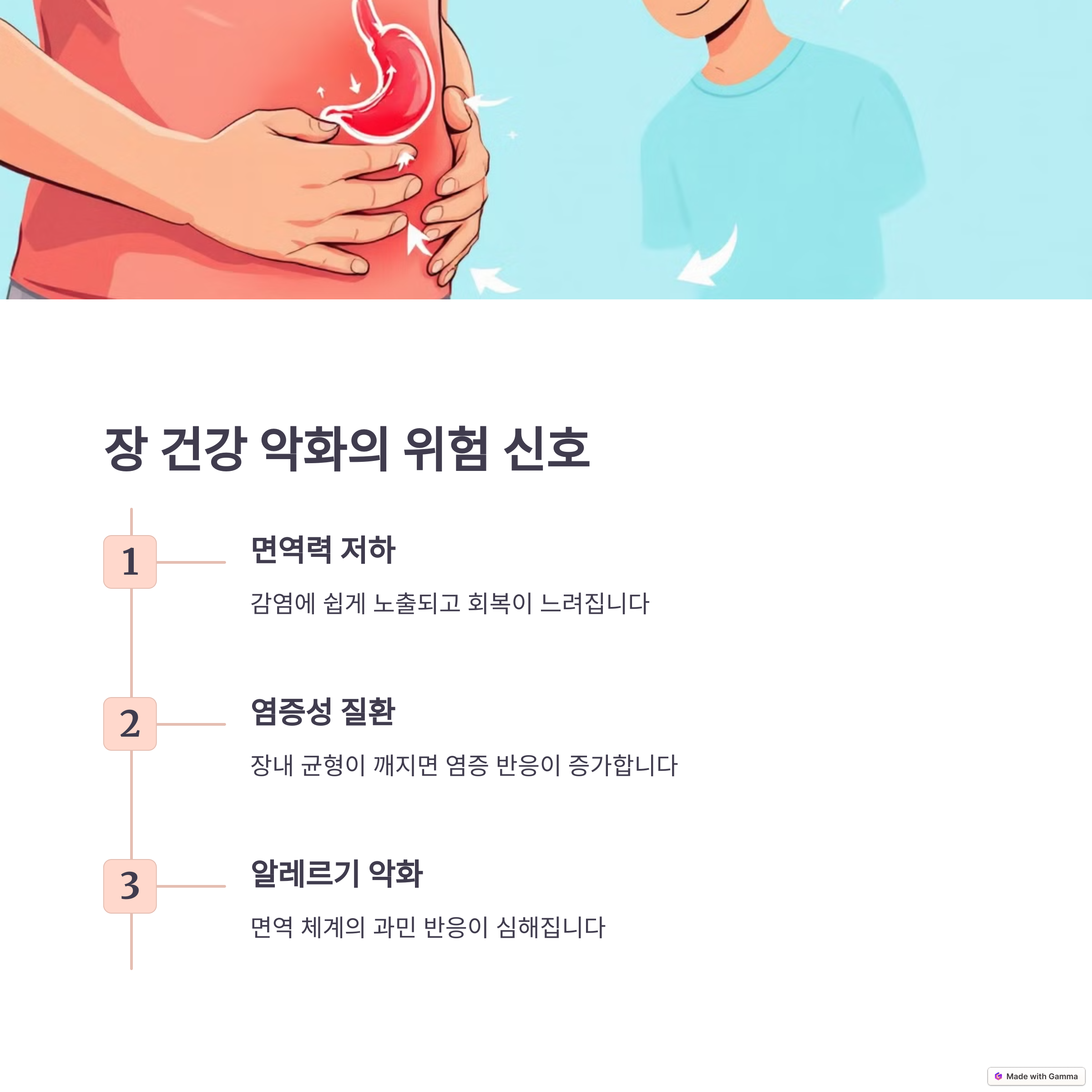 장 건강이 나빠지면 면역력 저하뿐만 아니라 알레르기, 자가면역 질환, 염증성 장 질환 등 다양한 문제를 유발할 수 있습니다. 따라서 건강한 식습관과 생활 습관을 유지하는 것이 필수적입니다.