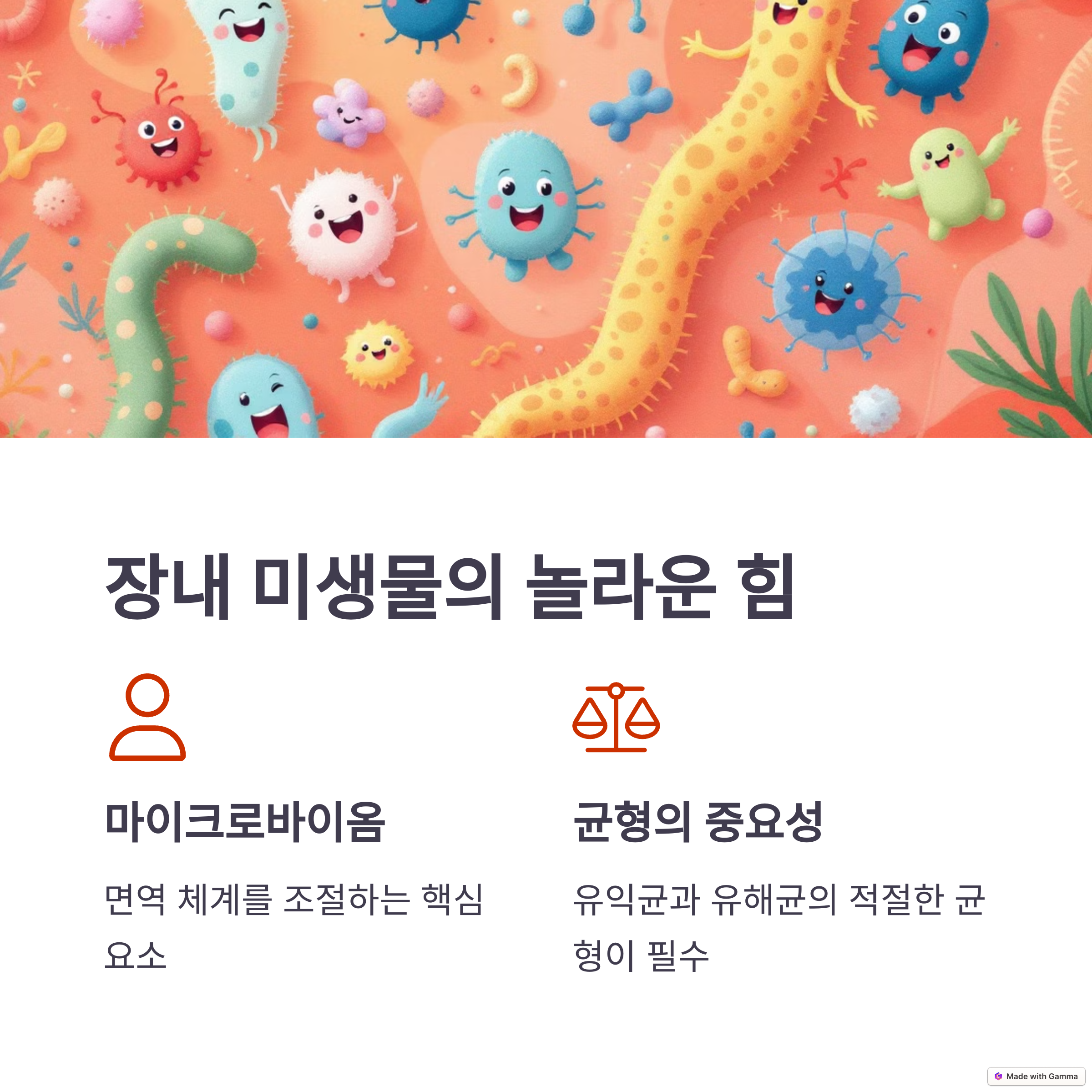 | 장내 미생물 | 유익균과 유해균의 균형이 면역력을 결정합니다. |