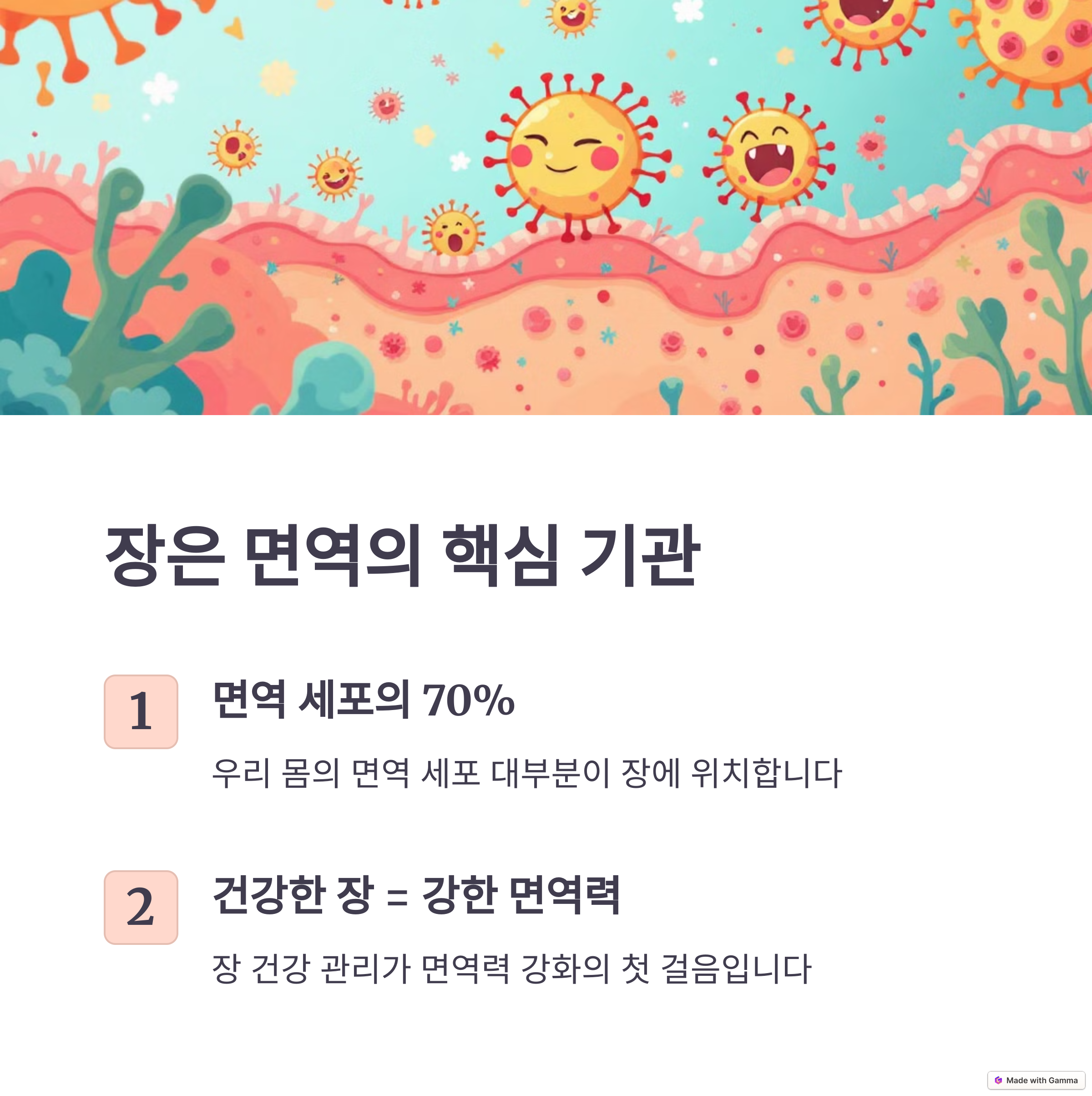 | 장내 미생물 | 유익균과 유해균의 균형이 면역력을 결정합니다. |