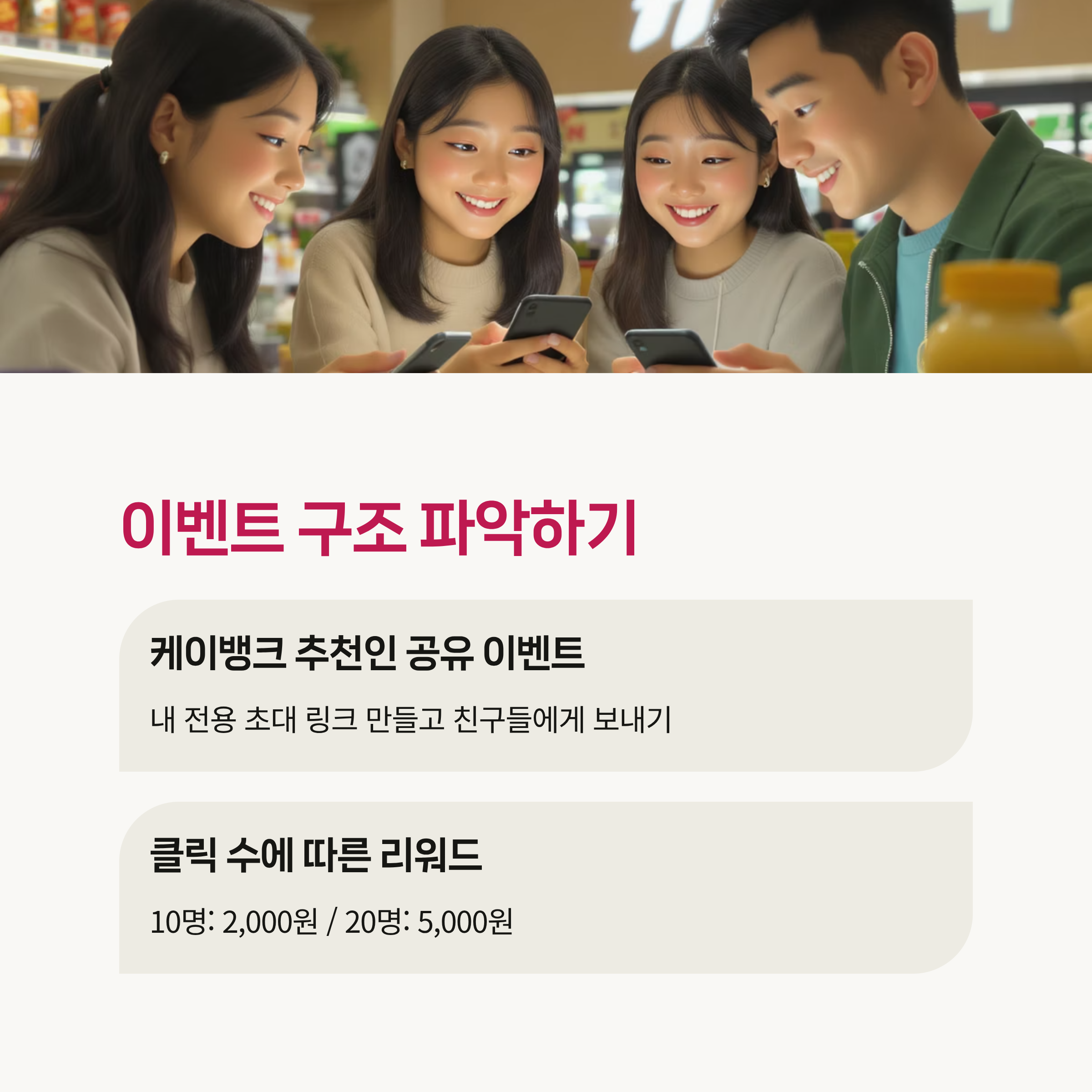 케이뱅크 추천인 이벤트로 CU 편의점 금액권 받는 법! 클릭만 받아도 상품권이 지급되며, 참여방법도 간단합니다. 선착순 5,000명 한정 혜택이니 지금 바로 시작하세요.
