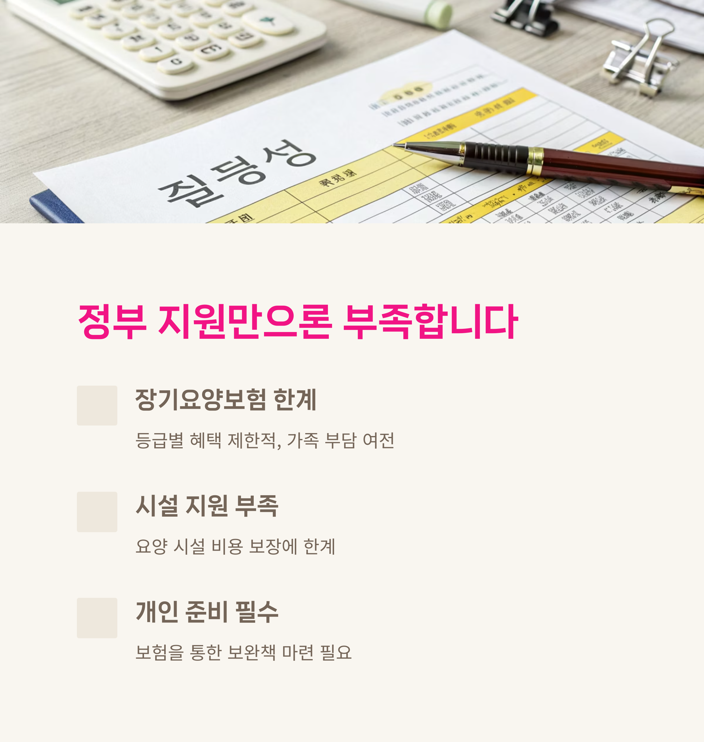 국가 제도는 등급을 받아야 하며 혜택도 제한적이에요. 장기적으로 간병이 필요한 경우엔 보험으로 부족한 부분을 보완해야 현실적인 대비가 됩니다.