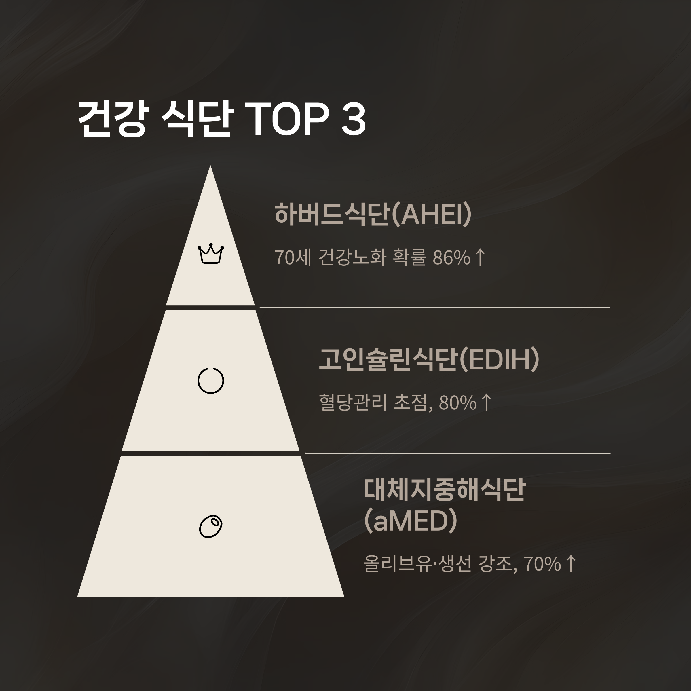 30년 추적 연구로 입증된 하버드식단 AHEI, 건강한 노화 확률을 86%까지 높여줍니다. 과학적으로 검증된 장수 식단, 지금부터 한 끼씩 실천해보세요.