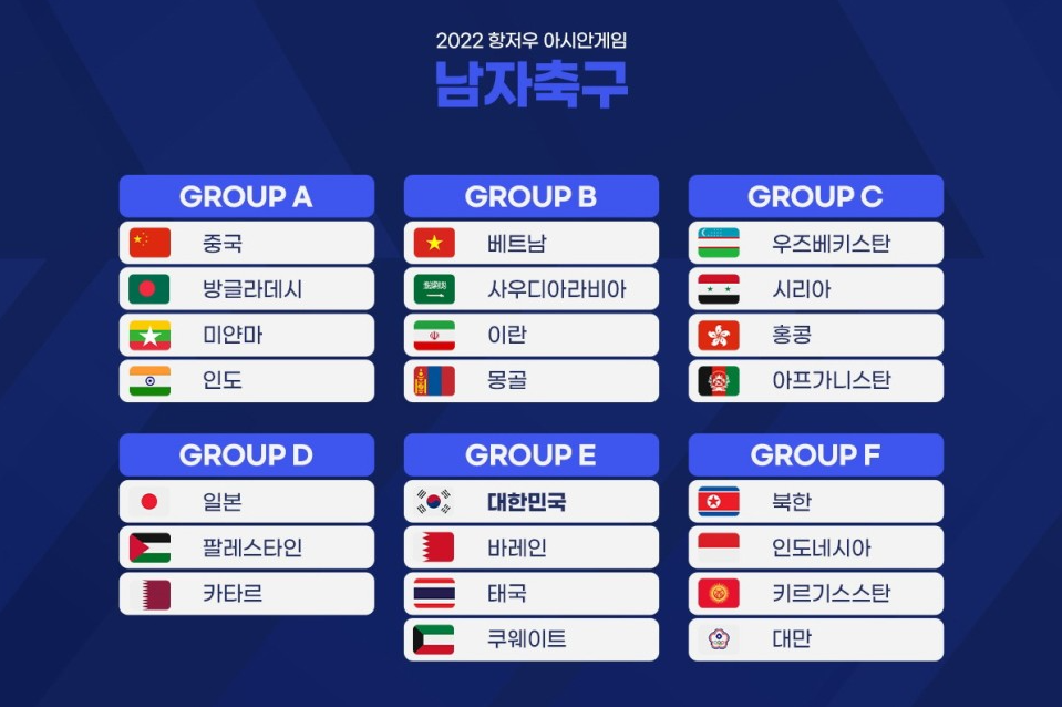 항저우 아시안게임 남자 축구 대표팀은 E조에 속해 있으며, 쿠웨이트, 태국, 바레인과 경기를 펼칩니다.