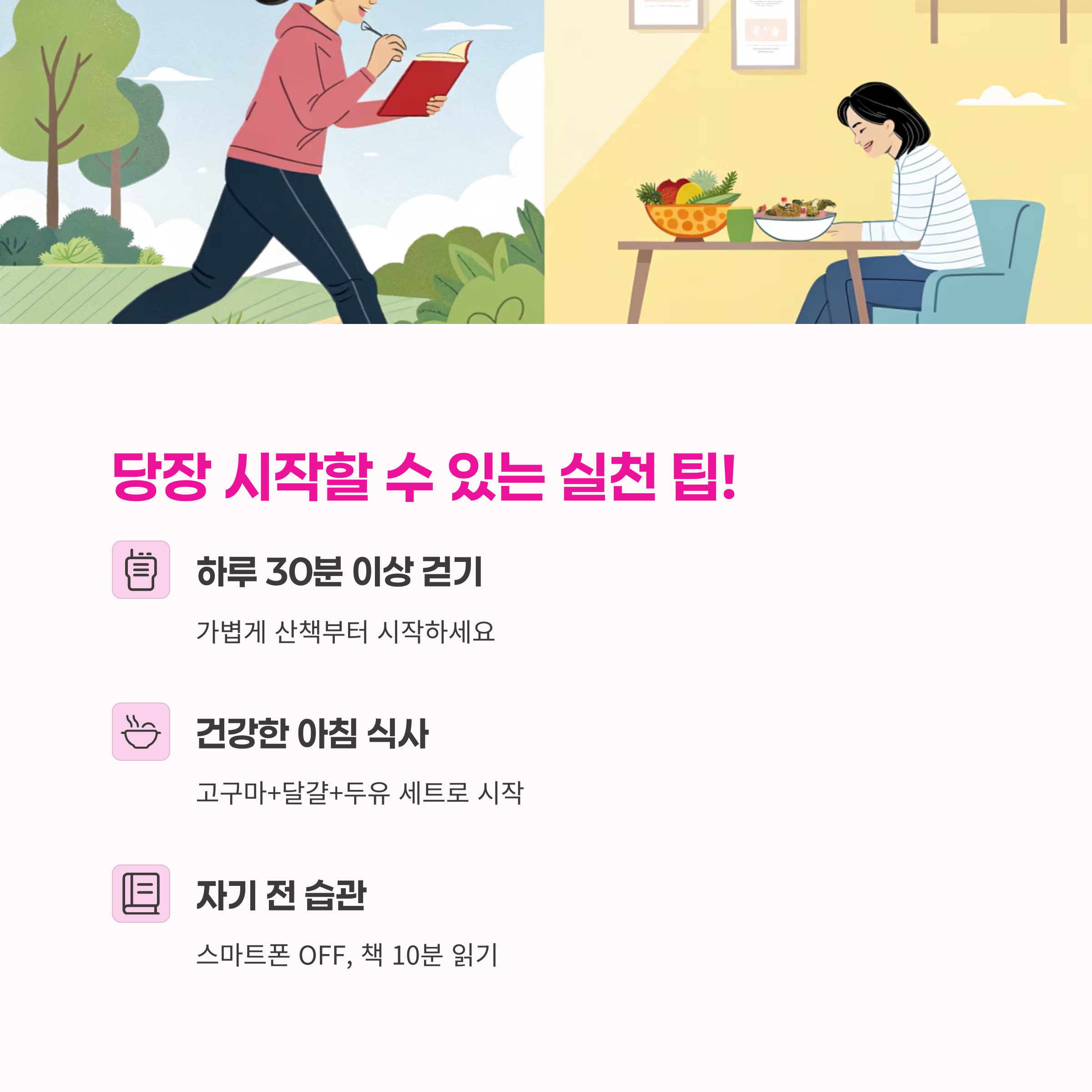 • 하루 30분 이상 걷기 (가볍게 산책부터!)