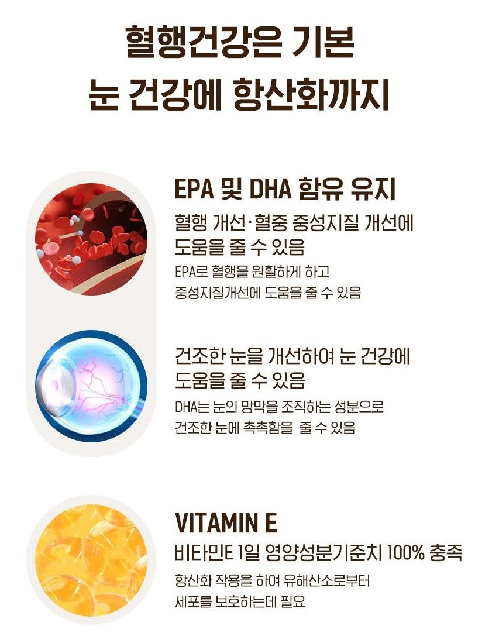 제품명에 ‘듀얼’이라는 말이 붙은 이유는, EPA와 DHA 함량이 고르게 들어 있어 혈중 중성지방 개선과 눈 건강, 기억력 개선에까지 도움을 줄 수 있기 때문이에요.
