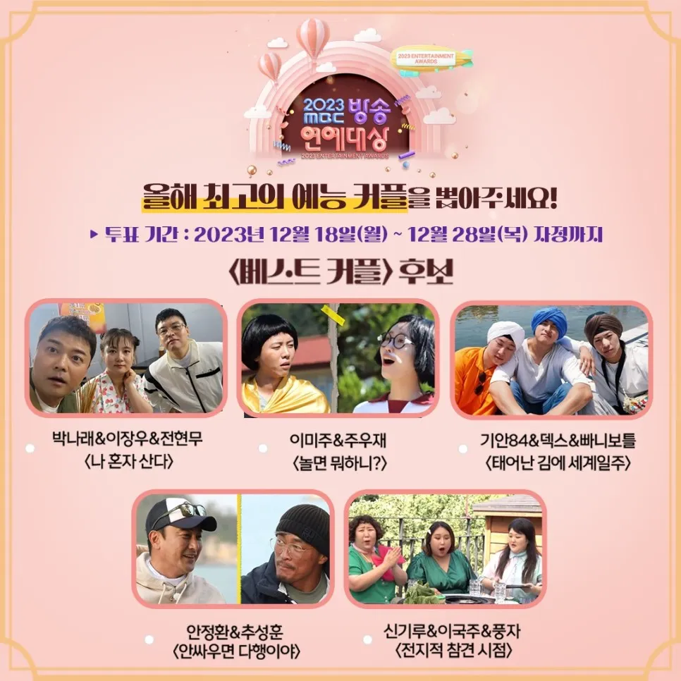 MBC 방송연예대상에서는 매년 '베스트커플상'이 큰 화제가 됩니다. 예를 들어, 박나래&이장우 커플이나 '내가 태어난 동안 세계일주'를 다녀온 기안84&덱스&파니보틀 팀과 같은 커플들이 파장을 일으키고 있습니다.
