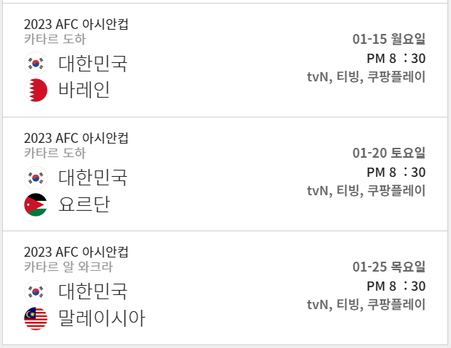 | 2024. 1. 15. (월) 오후 8:30 | 대한민국 vs 바레인 | tvN tvN SPORTS 쿠팡플레이 티빙 |