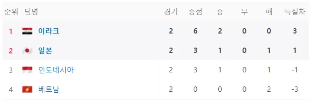 2024 아시안컵 D조에서 일본은 조 1위가 될 가능성이 높습니다. 최근 걸프 컵 우승으로 분위기를 끌어올린 이라크가 걱정 요소입니다. 일본은 베트남 원정에서 겨우 0:1로 승리하고 홈에서 무승부를 거둔 경험이 있어 긴장을 놓지 않아야 합니다.