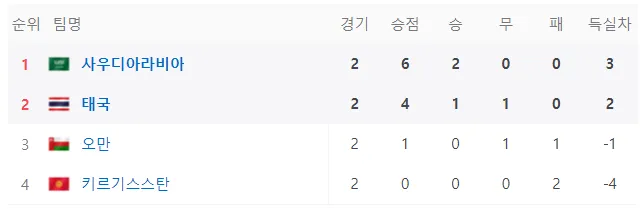 키르기스스탄 대 사우디아라비아는 1차전에서 격렬한 경기를 펼칠 예정입니다. 키르기스스탄은 이 경기에서 패배하면 16강 진출 기회를 잃게 됩니다. 오만이 태국을 이긴다면 키르기스스탄은 역전 2위의 희망을 가질 수 있지만, 동시에 오만에게 최소 3골을 넣고 이기는 것은 어려운 도전입니다.